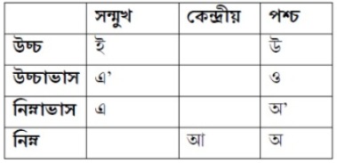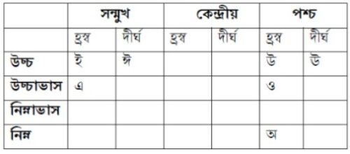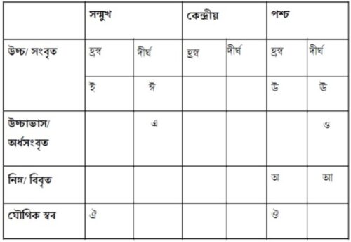 উচ্চাৰণ-কৰণ আৰু উচ্চাৰণ-স্থান অনুযায়ী অসমীয়া ভাষাৰ স্বৰধ্বনিসমূহক তলত দেখুওৱা ধৰণে তালিকাকৰণ কৰিব পাৰি:–