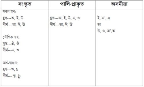 ওপৰৰ আলোচনাৰ পৰা আমি সংস্কৃত, পালি-প্ৰাকৃত আৰু অসমীয়া স্বৰধ্বনিসমূহৰ আমি তলত বৰ্ণিত ধৰণে আলোচনা কৰিব পাৰোঁ—